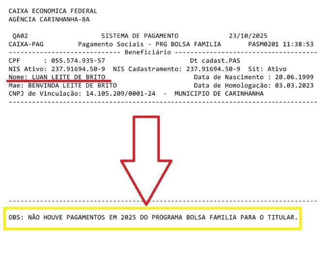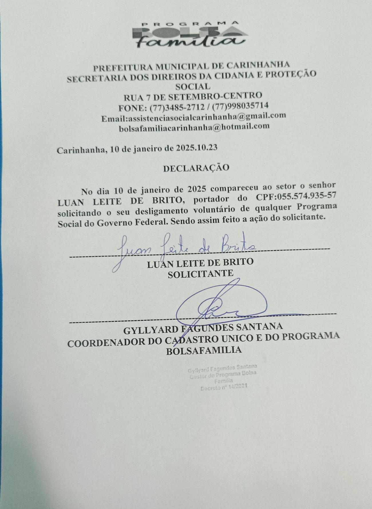 O Coordenador de Cadastro Único e Bolsa Família emitiu uma Declaração informando que Luan do Povo compareceu dia 10/01/2025 na Secretaria de Assistência Social onde solicitou seu DESLIGAMENTO VOLUNTÁRIO do Programa Bolsa Família, não recebendo NENHUMA PARCELA DO BENEFÍCIO DESDE A POSSE COMO VEREADOR NO MUNICÍPIO DE CARINHANHA
