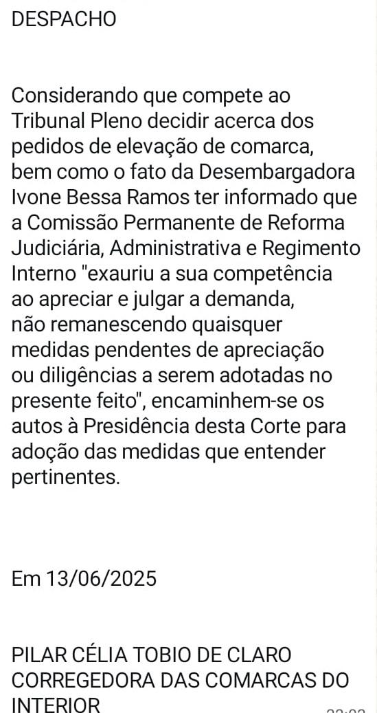 No mesmo dia o Processo Administrativo de nº TJ-ADM-2024/96413, (que trata do referido pedido de elevação), foi despachado pela Exmª Srª Desembargadora, conforme print abaixo: